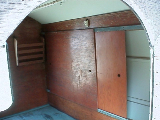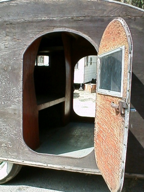 Here's a gorgeous little 1940's Teardrop travel trailer with it's own kitchen! Grab Lucy, Ethyl, and Fred, and head out camping! This adorable trailer was home made in the 40's and is larger than the average Teardrop. Measures 6' wide by approx. 11' long with doors on both sides! Beautiful all wood interior features a very large bed area with storage underneath, and even includes a sliding door closet! The back hatch opens up to reveal a kitchen complete with original turquoise paint, and the original travel stickers on the lid!! Kitchen features include a range top AND oven, (a scarce feature for a trailer of this size!), ice box, sink with water hookup, and a sliding door above the sink to hand food to inside the trailer! In wonderful original condition, complete and solid, but needs restoration. No title, but winner will be provided with the necessary information to obtain one. (1964 Intl. Travelall tow vehicle NOT included!)